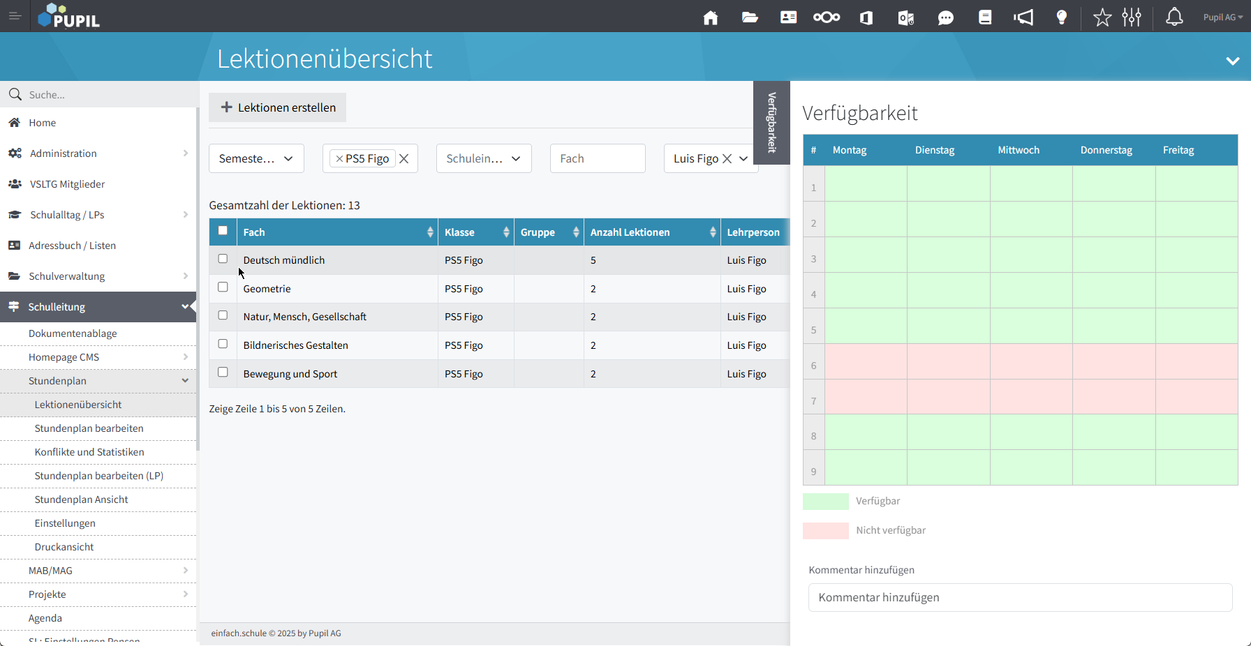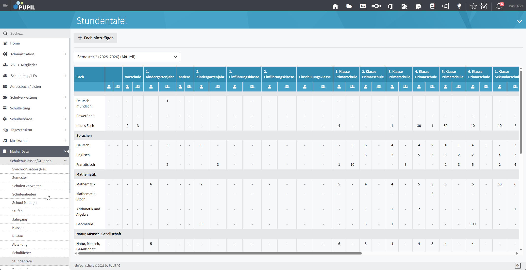 Die kantonale Stundentafel befindet sich unter Master Data – Schulen/Klassen/Gruppen, während die frühere Klassen- und Lehrpersonenübersicht nun als Lektionenübersicht im Bereich Schulleitung – Stundenplan geführt wird. Beide Ansichten wurden funktional erweitert und unterstützen eine effizientere Arbeit in der Stundenplanung.