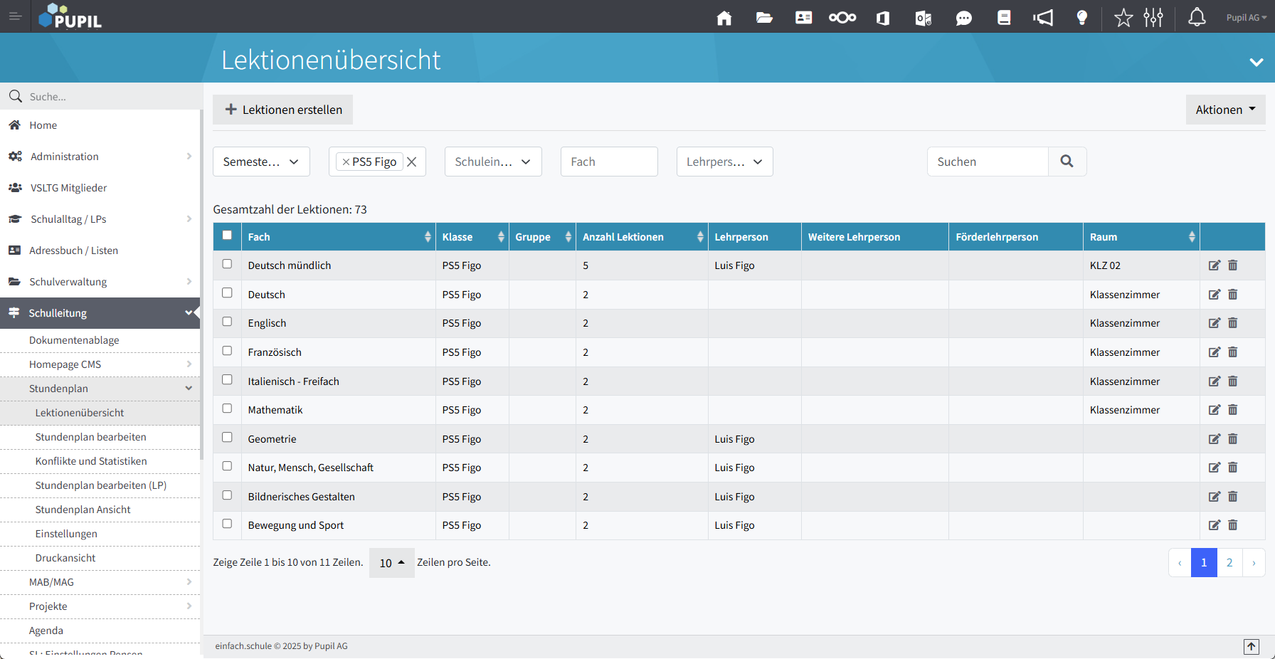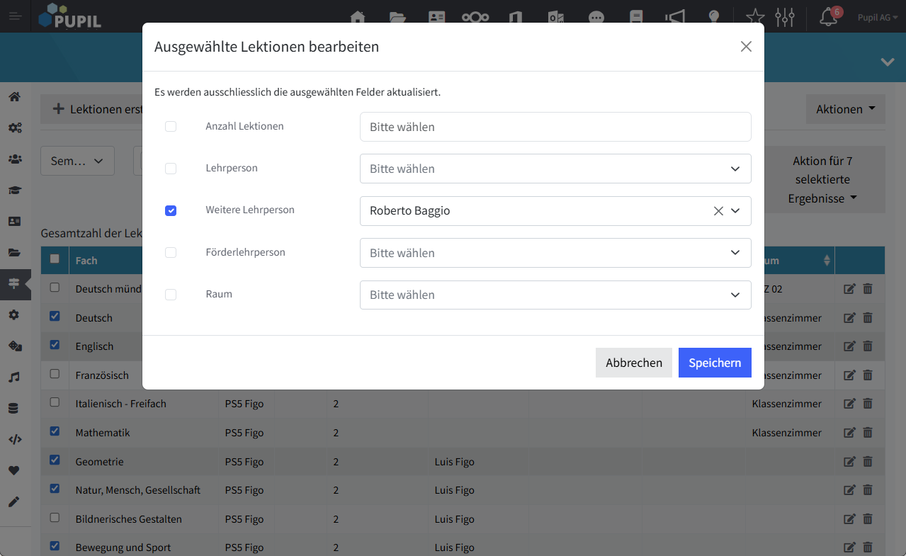 Die vormals getrennten Ansichten für Klassen und Lehrpersonen wurden zu einer gemeinsamen Lektionenübersicht zusammengeführt. Diese basiert weitgehend auf denselben Daten und ermöglicht es, alle Lektionen nach Bedarf zu filtern, anzupassen und zu verwalten. Mehrere Lektionen können gleichzeitig bearbeitet werden, wobei gezielt ausgewählt werden kann, welche Felder aktualisiert werden sollen (z. B. Anzahl Lektionen, Lehrpersonen, Räume). Auch das gleichzeitige Löschen mehrerer Lektionen ist jetzt möglich.