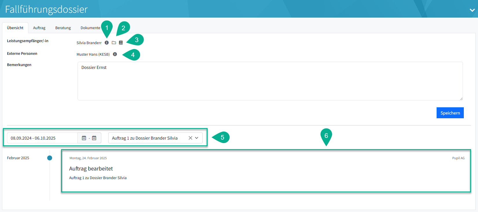 - Timeline: In der Timeline werden alle Änderungen innerhalb des Dossiers angezeigt. Das beinhaltet das Erstellen, Bearbeiten, Löschen, Abschliessen von Aufträgen und Beratungen sowie auch Änderungen am Dossier allgemein. Die Änderung wird mit Datum und Name vermerkt.