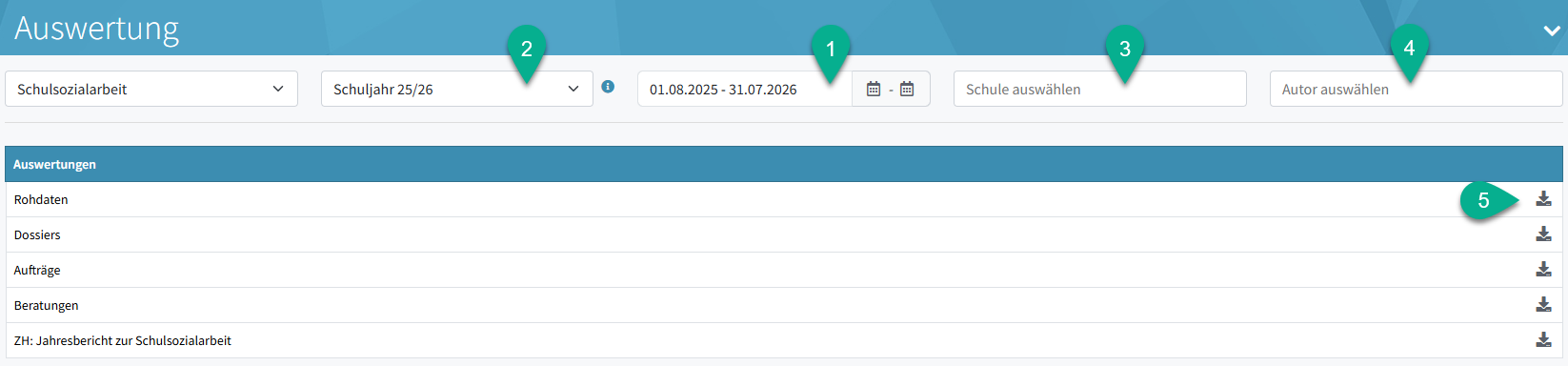 - ZH: Jahresbericht zur Schulsozialarbeit: Der Kanton Zürich verlangt von der Schulsozialarbeit vorgegebene Kennzahlen zur Schulsozialarbeit. In diesem Download sind alle nötigen Tabellen und Diagramme dazu abgelegt. Sie können direkt in den Abschlussbericht hineinkopiert werden. Damit dieser Download funktioniert bzw. die Daten gewünscht auswertet, müssen in der Konfiguration die korrekten Auftragskategorien definiert werden. Es handelt sich dabei um folgende: Beratung und Intervention, Etablierung / Niederschwelligkeit, Prävention / Bildungsangebot / Projekte, Qualitätssicherung, Vernetzung.