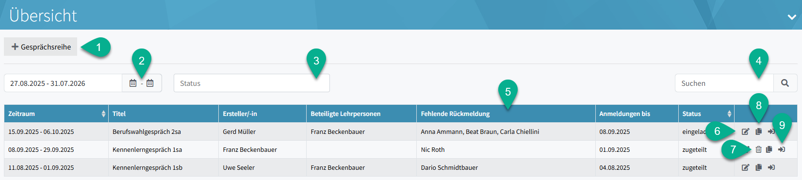 In dieser Ansicht werden in einer Tabelle alle Gesprächsreihen angezeigt, die man selber erstellt hat oder in der man als beteiligte Lehrperson hinzugefügt wurde.