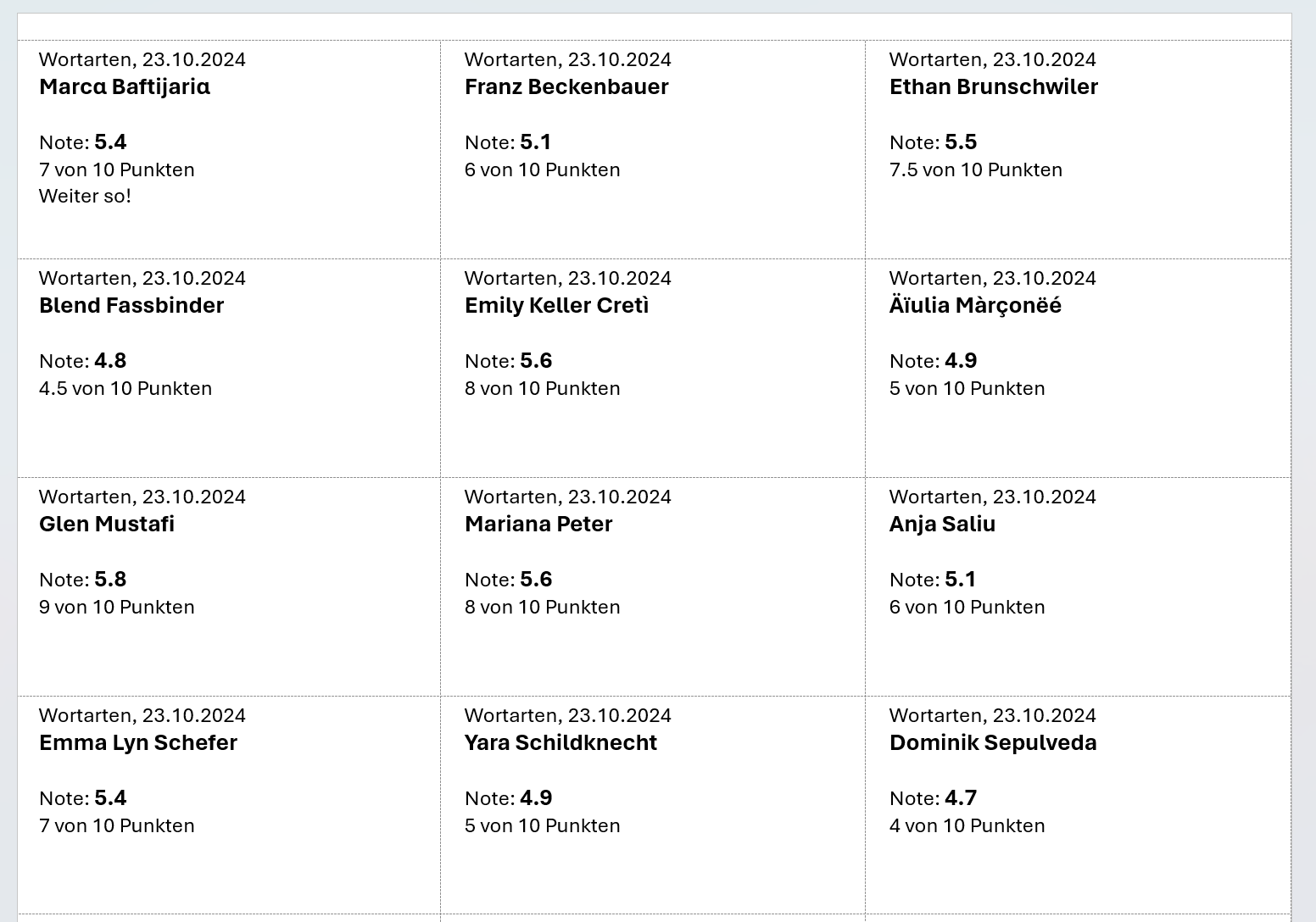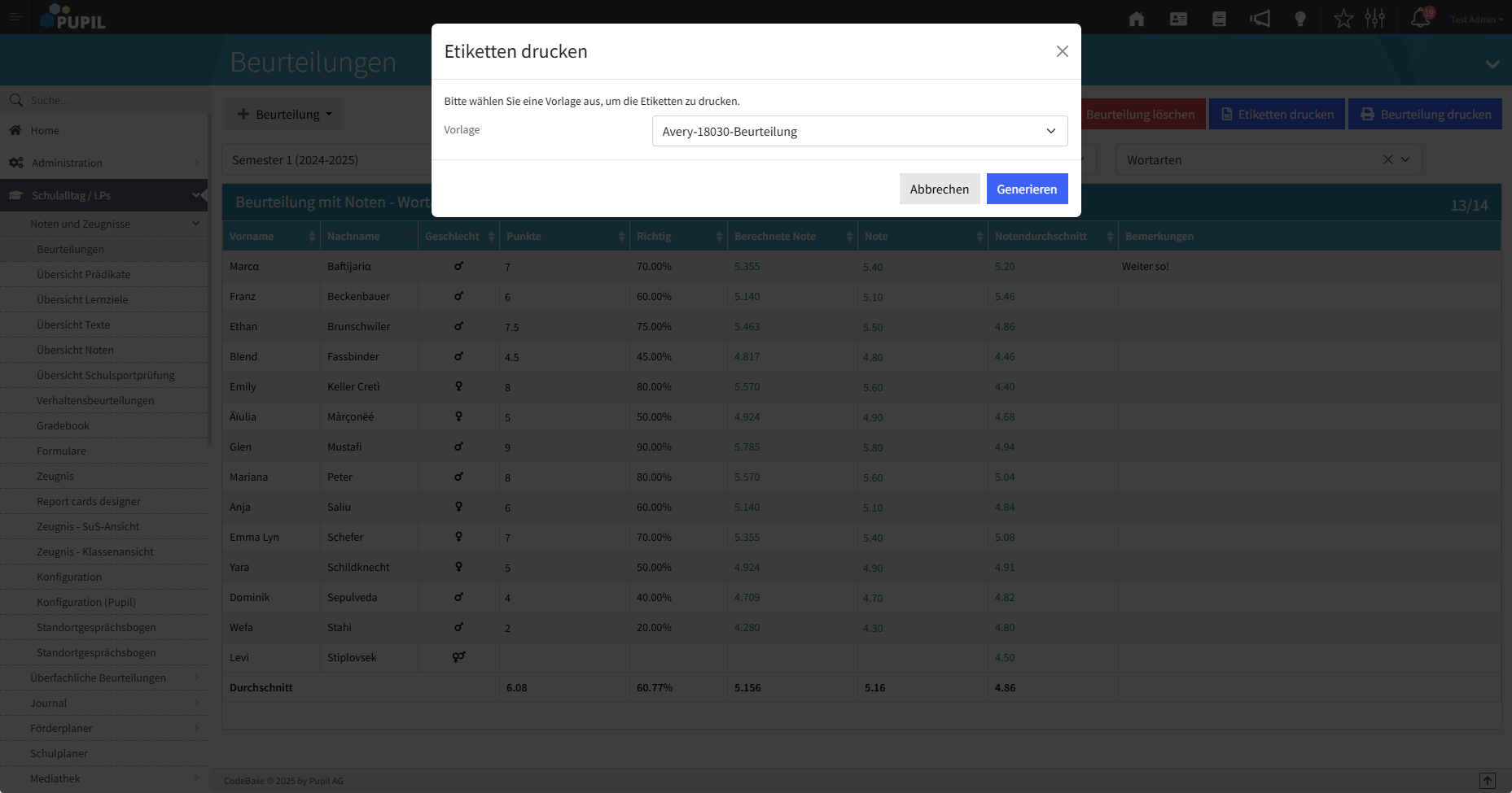 Für Beurteilungen mit Noten steht neu eine Funktion für den Etikettendruck zur Verfügung. Die Resultate der Schüler*innen können mithilfe von Word-Vorlagen als Etiketten ausgegeben werden.