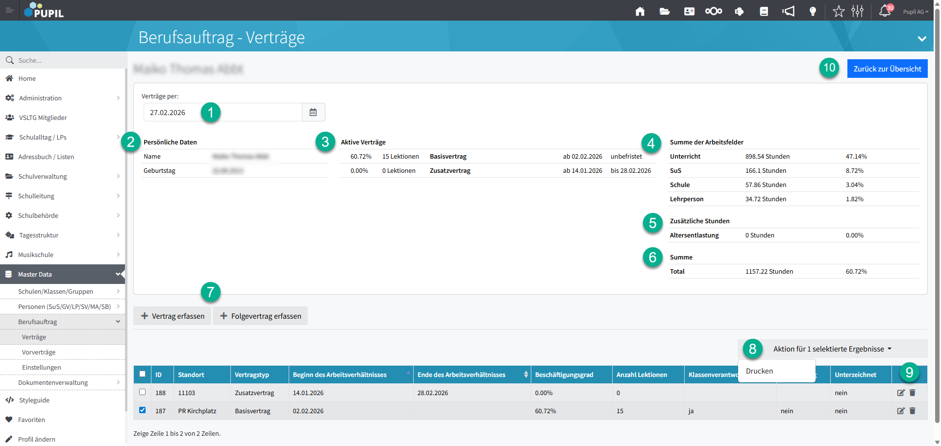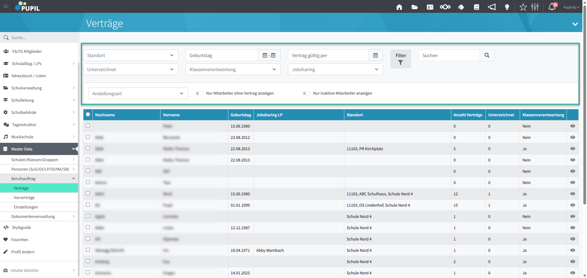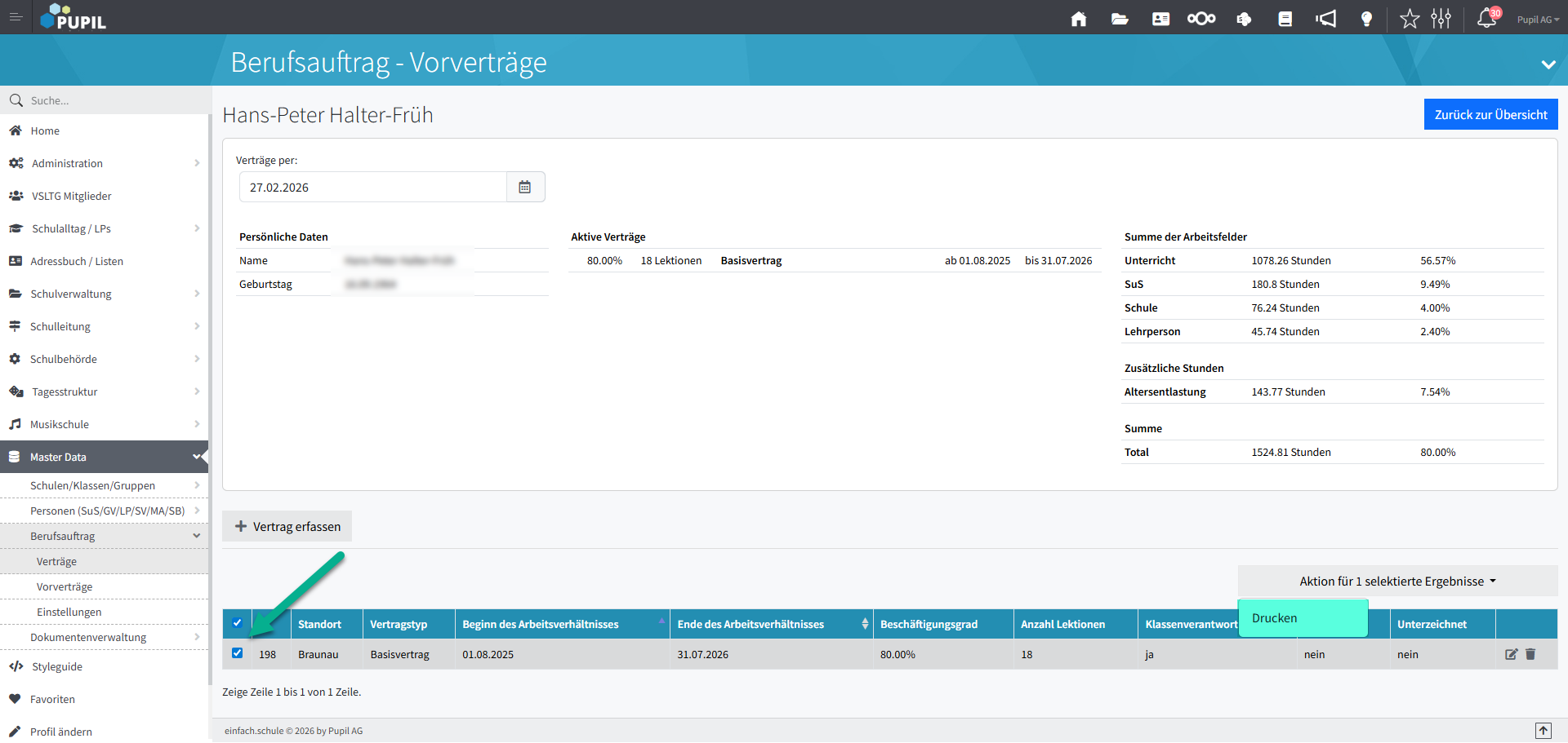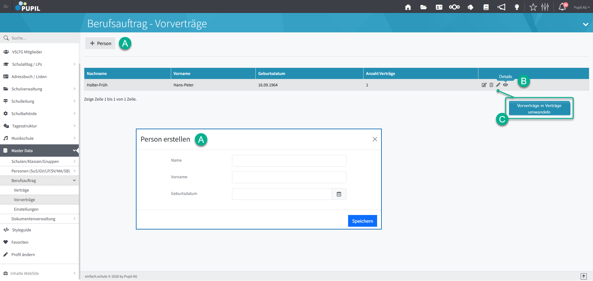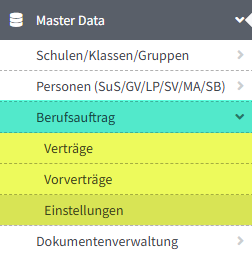 Das Modul ist zu finden unter Master Data → Personen (SuS/GV/LP/SV/SB). Das Menü ist aufgeteilt in Verträge, Vorverträge und Einstellungen.