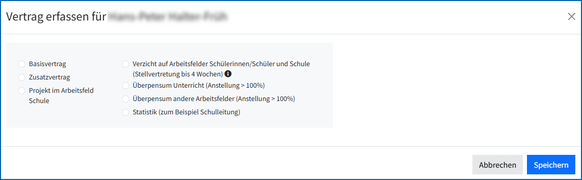 Mit Button [ + Person ] wird das Modal "Person erstellen" geöffnet. Hier werden wie erwähnt Name, Vorname und Geburtsdatum erfasst. Mit Button [ speichern ] wird der Datensatz angelegt. Anschliessend wird rechts via Icon "Auge" - Details - die Detailansicht dieser Person aufgerufen. Bis auf Name, Vorname und Geburtsdatum ist noch nichts vorhanden. Mit Button [ + Vertrag erfassen ] wird das gleichlautende Modal geöffnet. Die Erfassung von Basisvertrag, Zusatzvertrag oder Projekt im Arbeitsfeld Schule wird analog "Berufsauftrag - Verträge" erfasst, was weiter unten erläutert wird.