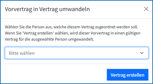 Via Editor-Icon "Vorverträge in Verträge umwandeln" wird das gleichnamige Modal geöffnet: