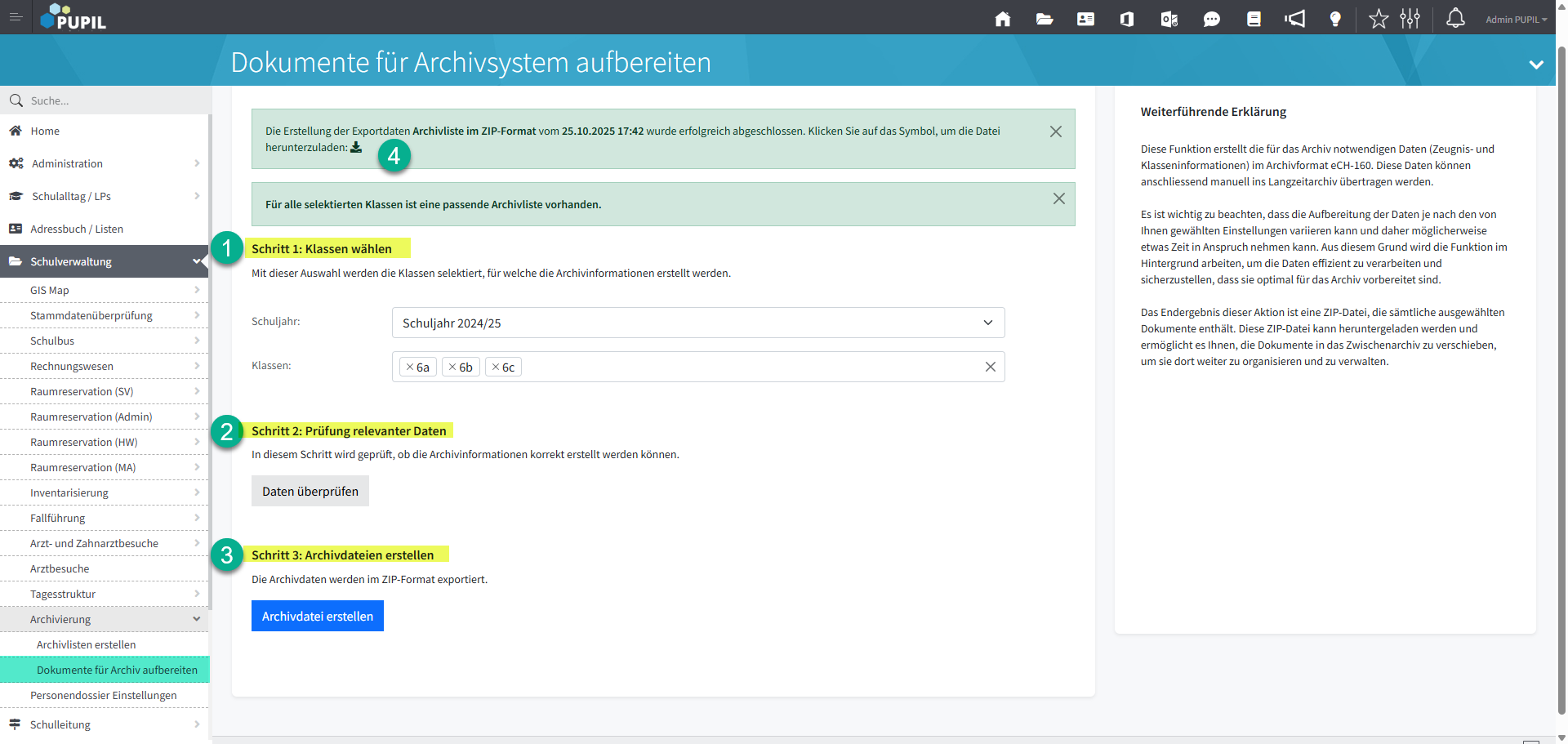 In der Schulkontrolle können Mitarbeitende der Schulverwaltungen unkompliziert die PDF-Übersichten mit den zeugnisrelevanten Daten archivieren. Die erstellten PDFs lassen sich innerhalb von PUPIL ablegen oder als ZIP-Datei exportieren. Damit ist es möglich, alle relevanten Unterlagen eines Schuljahres sicher zu archivieren und bei Bedarf erneut einzusehen.