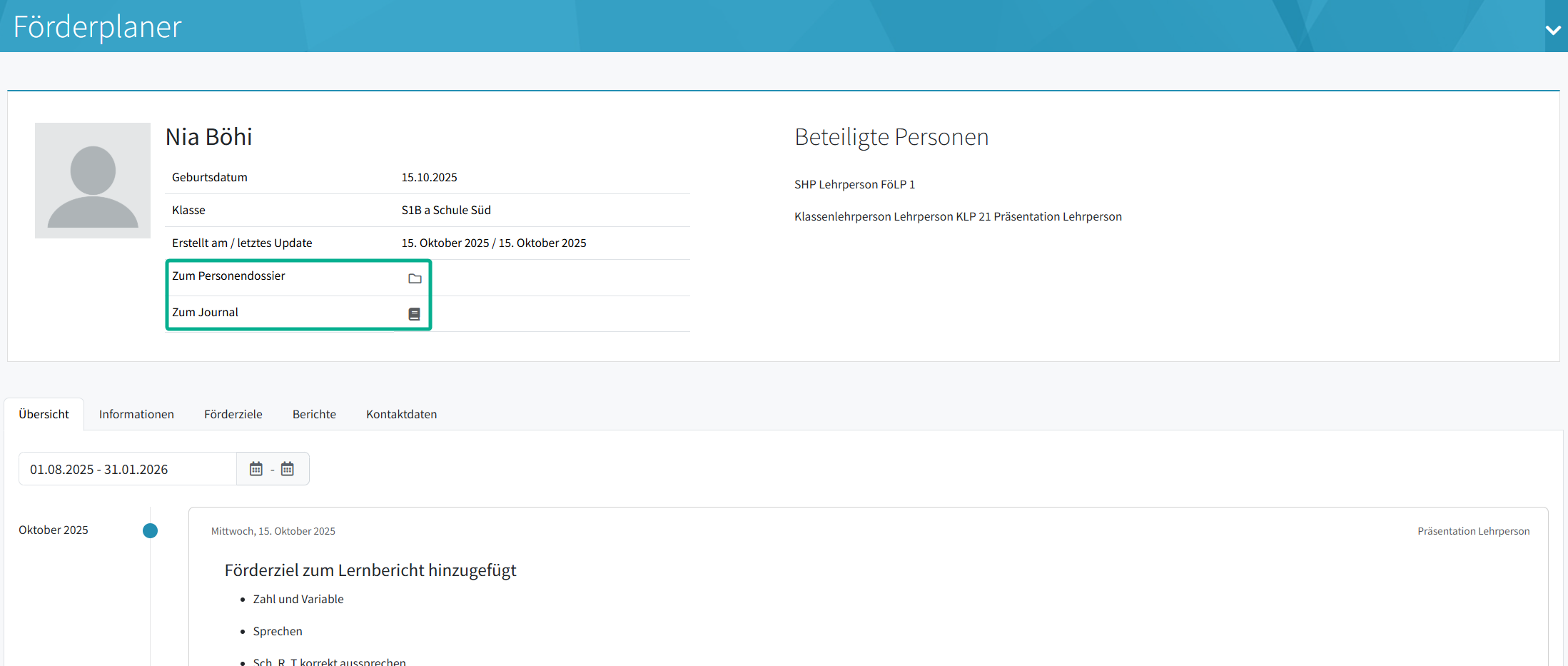 Das Journal und das Personendossier können direkt aus dem Förderplaner aufgerufen werden. Dabei sind die beiden Module so verlinkt, dass man direkt zu der entsprechenden Schülerin beziehungsweise dem entsprechenden Schüler gelangt.