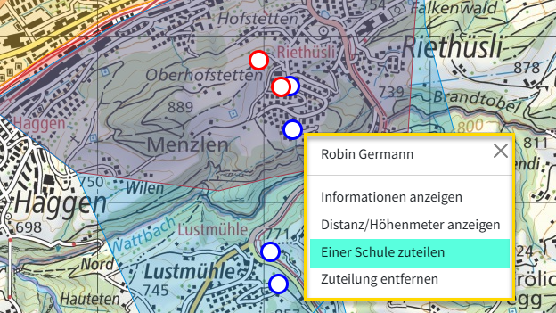 ▶️ In der Karte navigieren → durch Klick auf einen SuS-Punkt wird das oben erwähnte Kontextmenü angezeigt.
