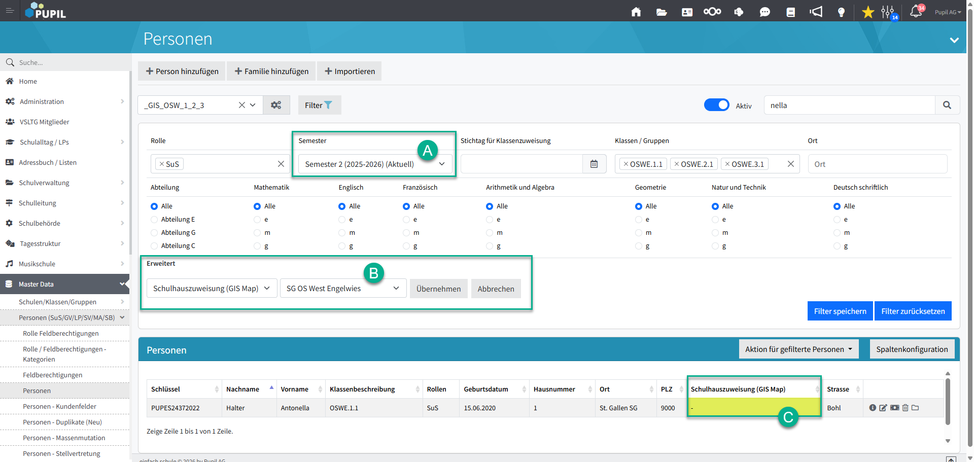 Im diesem Anschauungsbeispiel ist bei Antonella das Feld Schulhauszuweisung leer. Weil im Semester [ A ] für Antonella noch keine Schulhauszuweisung vorgenommen wurde. Und der erweiterte Filter [ B ] wurde noch nicht übernommen, sonst würde Antonella auch nicht mehr aufgeführt werden. Denn sie hat ja "Engelwies" nicht.