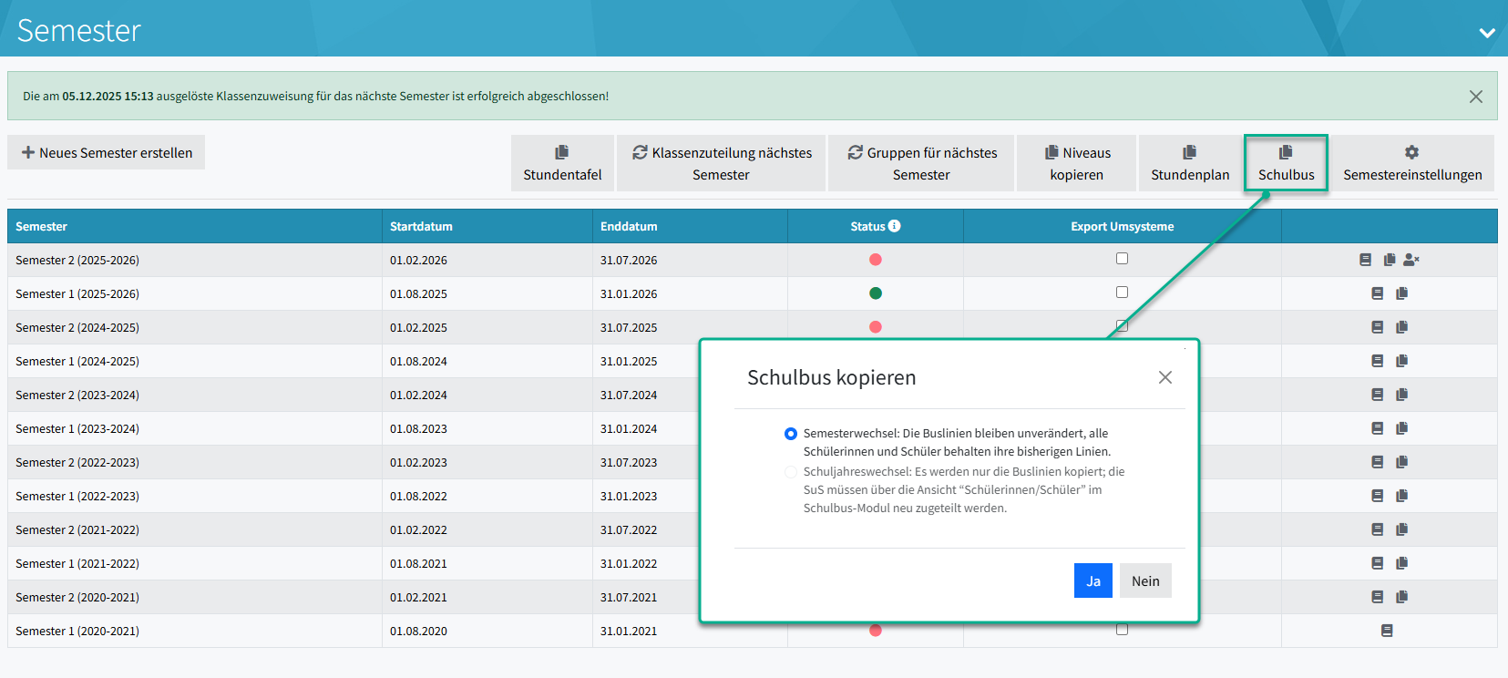 In Schulen/Klassen/Gruppen ist unter Semester der Button [ Schulbus ] aufgeführt. Damit können die Semester basierten Daten aus Linien und Fahrplan Übersicht ins nächste Semester oder Schuljahr kopiert werden.