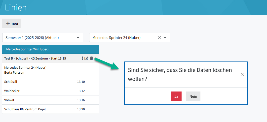 Nach der Erstellung der Linien werden diese in der Übersicht angezeigt. Die Linien können nach Semester und Fahrzeug gefiltert werden.