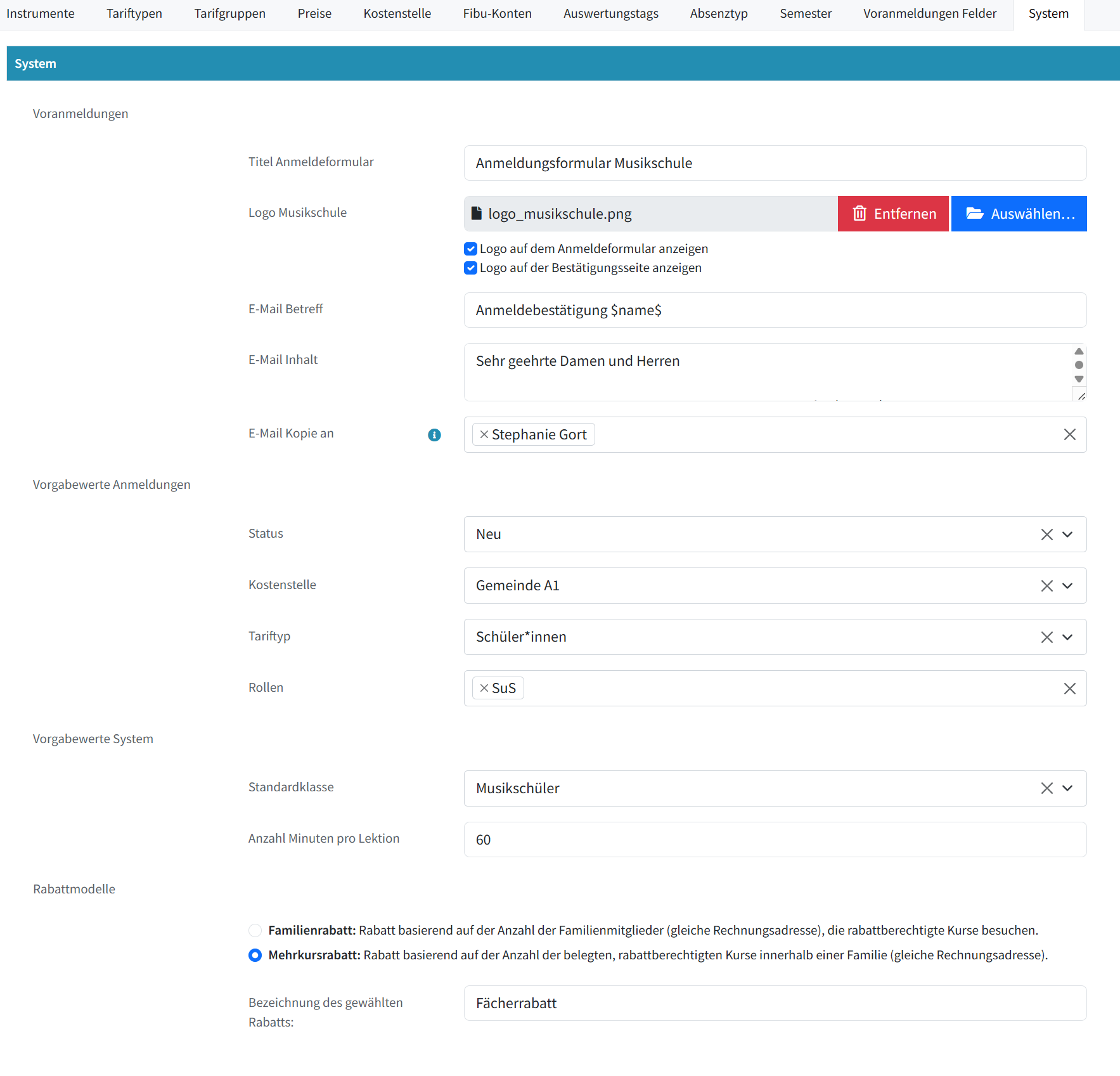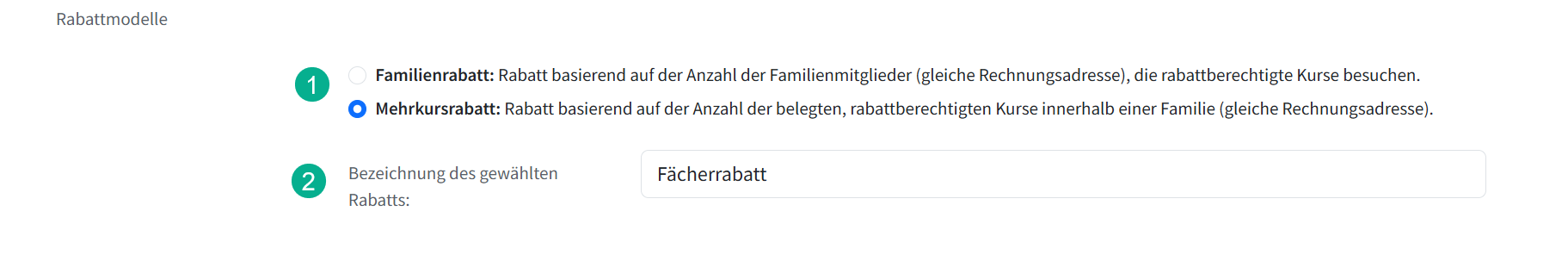 Hier lässt sich einstellen, ob die Musikschule mit einem Familienrabatt oder einem Mehrkursrabatt (Fächerrabatt) arbeiten möchte.