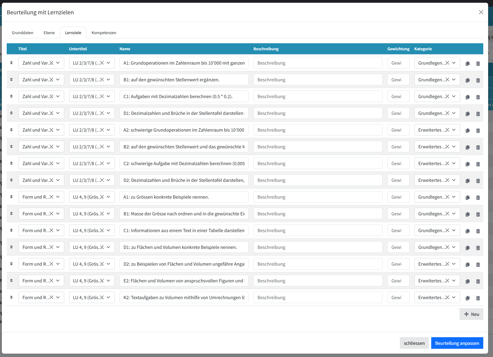 Nachdem die Überschriften festgelegt wurden, können die entsprechenden Lernziele in einer editierbaren Tabelle eingetragen werden. Die Lernziele können flexibel als grundlegend oder erweitert kategorisiert werden, um die individuelle Lernentwicklung jedes Schülers oder jeder Schülerin zu dokumentieren.