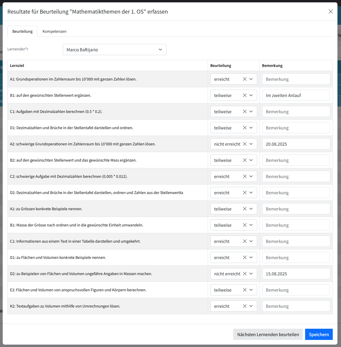 Die Beurteilung erfolgt direkt nach den zuvor definierten Lernzielen. Lehrpersonen können die Lernziele für jede*n Schüler*in individuell bewerten und dabei die festgelegte Skala anwenden.