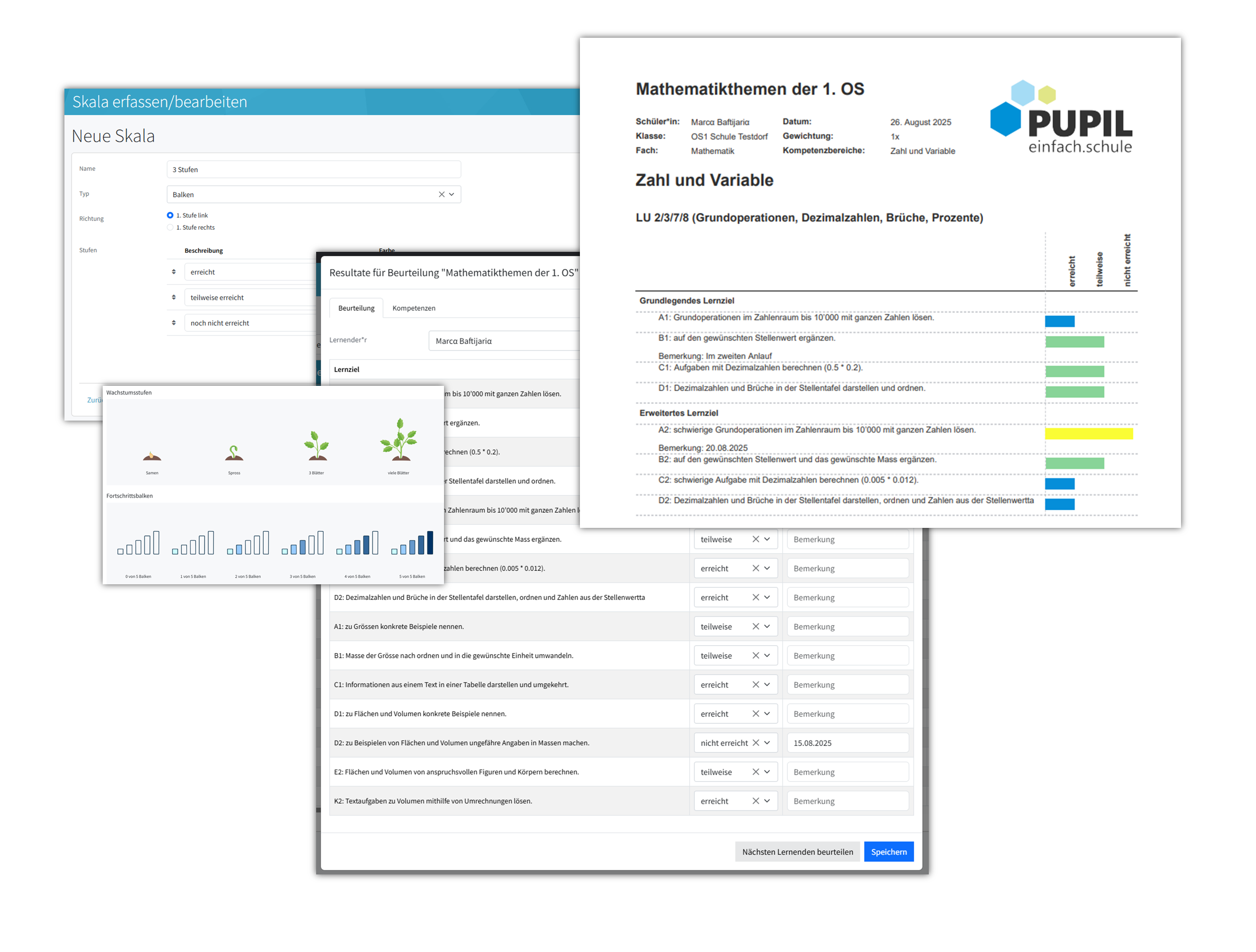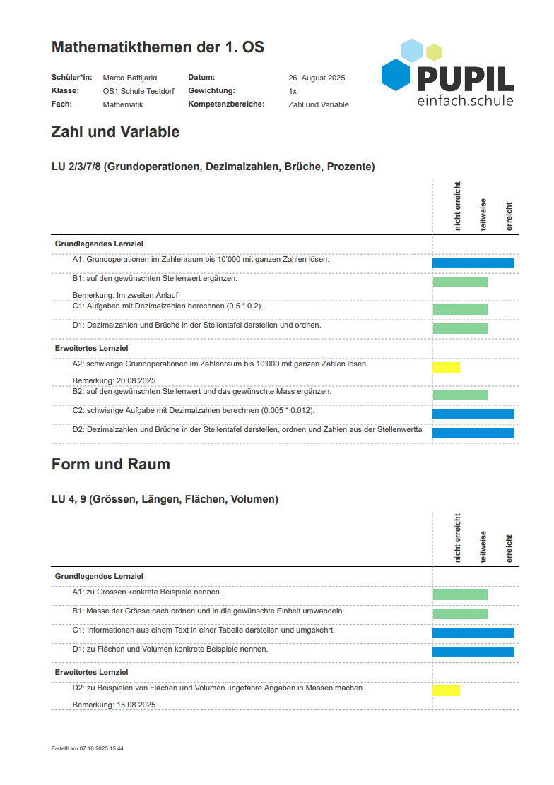 PUPIL bietet eine zusätzliche Möglichkeit der Beurteilung an: „Beurteilung mit Lernzielen“. Diese neue Beurteilungsart ermöglicht es Lehrpersonen, die Leistungen der Lernenden anhand von Lernzielen zu bewerten und dabei eine individuelle Skala zu nutzen.