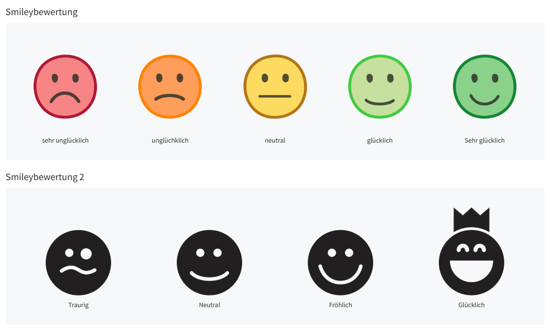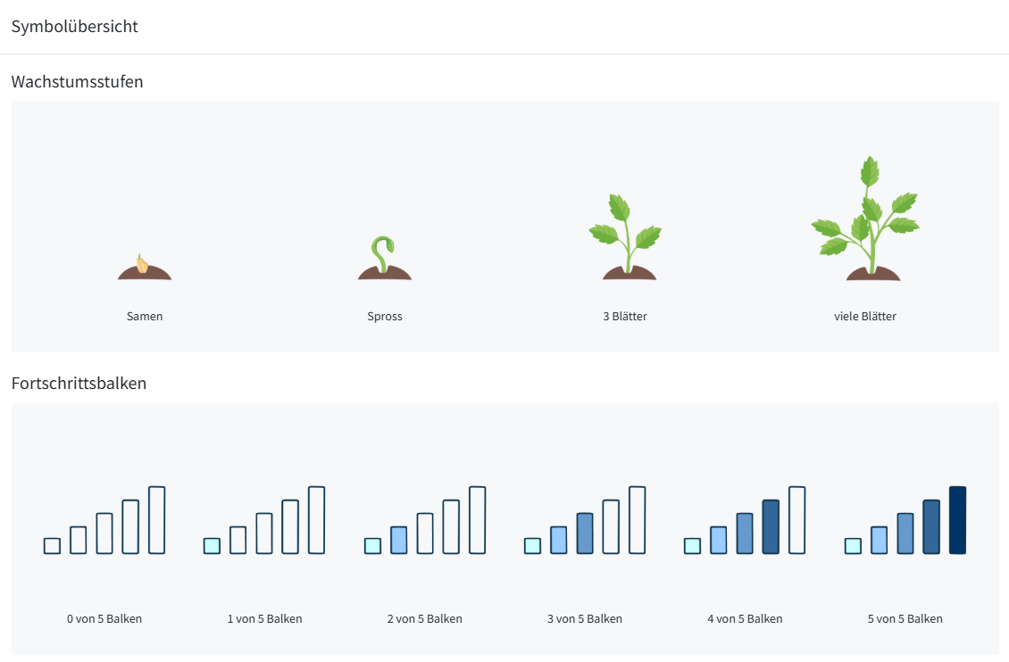 Jede Bewertungsstufe wird durch ein passendes Bild oder Piktogramm angezeigt. Eine Legende am Ende der Seite erklärt die Symbole.
