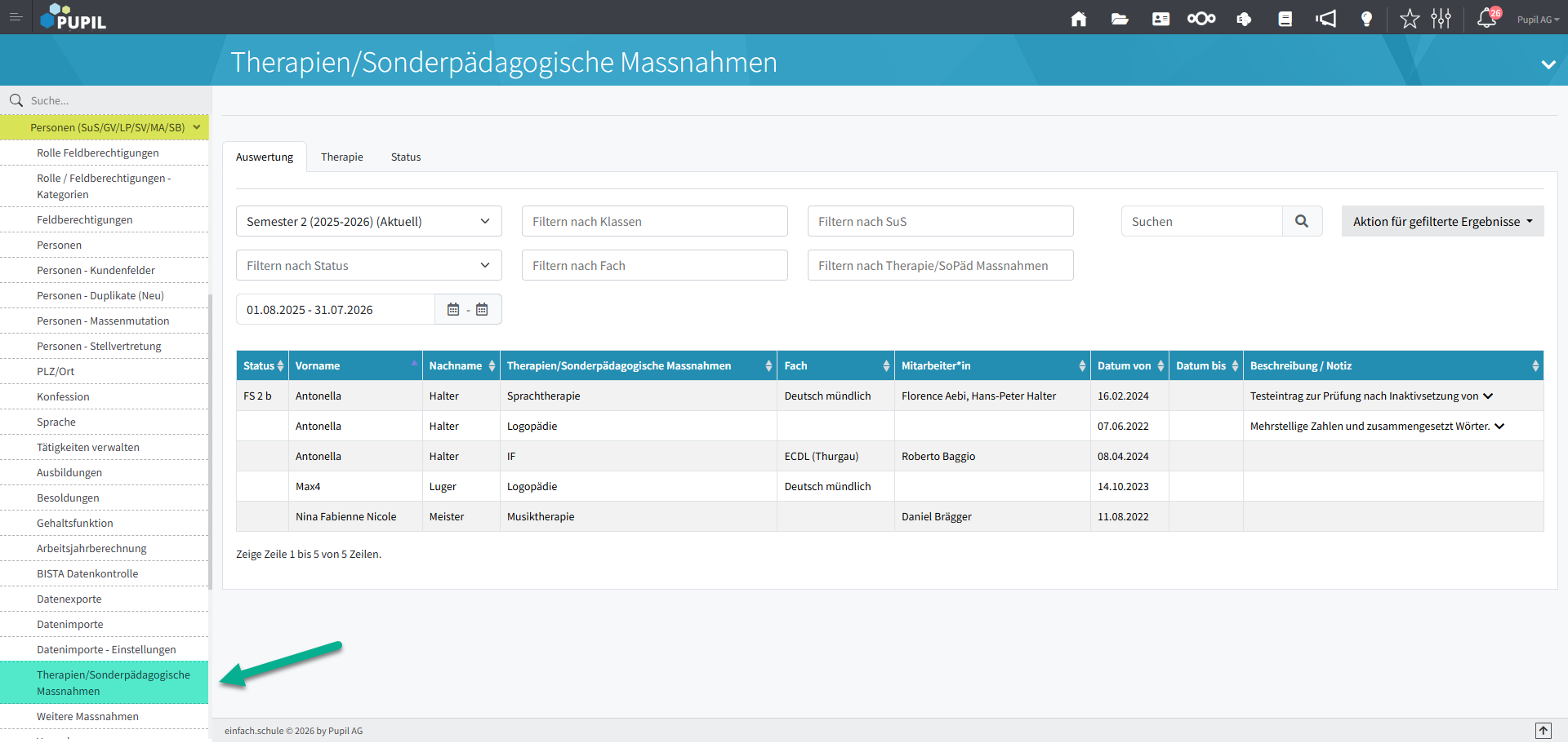 Die hier folgende Dokumentation behandelt die Funktionen im Menü Therapie/Sonderpädagogische Massnahmen.