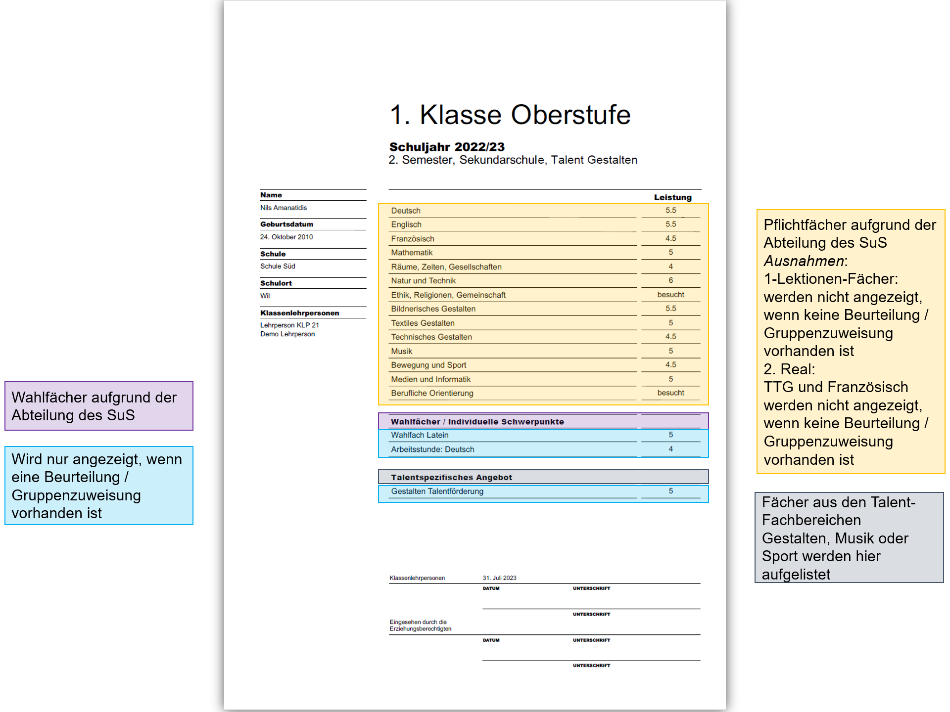 Das Zeugnis für Talentschulen unterscheidet sich in einigen Punkten vom regulären Zeugnis.