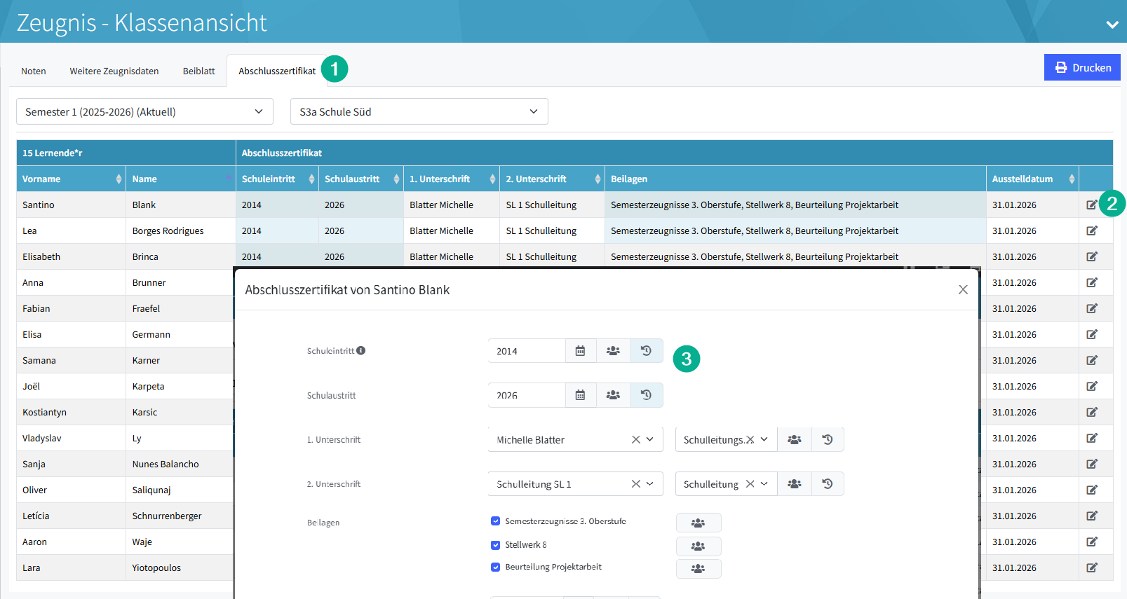 Das Abschlusszertifikat lässt sich nur im zweiten Semester der 2. oder 3. Oberstufe ausfüllen. Gedruckt werden kann es in beiden Semestern.