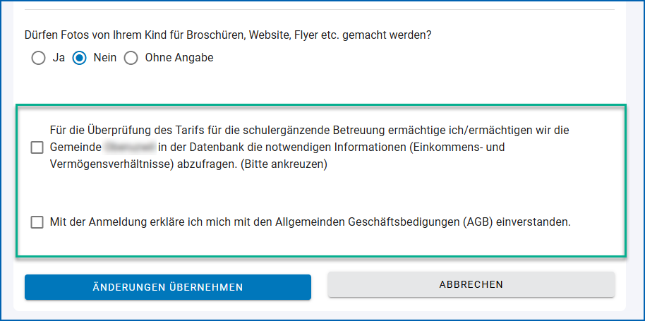 Nach erfolgreichem Login wird den Eltern das erstellte Formular angezeigt. Nicht bearbeitbare Felder sind grau. Pflichtfelder werden geprüft, wenn das Formular eingesendet werden soll. Sind nicht alle Pflichtfelder ausgefüllt, wird eine entsprechende Meldung angezeigt.