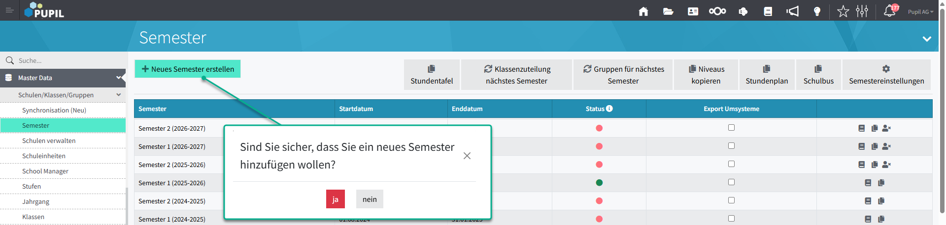 Damit geschieht noch fast nichts. Deshalb beim Schuljahreswechsel bereits anlegen. Beispiel: Vor dem Wechsel zu SJ S2-25-26 → S1-26-27 und S2-26-27 anlegen.