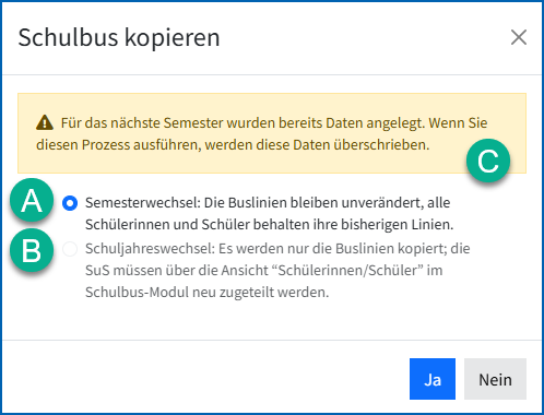 Optionen bei aktivem Semester 2: Zusätzlich Schuljahreswechsel: Es werden nur die Buslinien kopiert; die SuS müssen über die Ansicht “Schülerinnen/Schüler” im Schulbus-Modul neu zugeteilt werden.