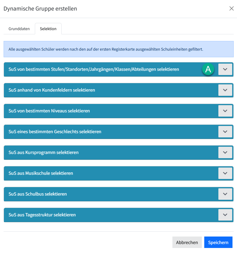 Bei dynamischen Gruppen kann man Lernende eine Selektion der Lernenden nach einem oder mehreren Kriterien vornehmen und diese so einer Gruppe zuordnen. Dies ermöglicht einem Zuteilungen schneller vorzunehmen und es minimiert Zuteilungsfehler. Ein klassisches Beispiel um dynamische Gruppen zu erstellen, ist der geschlechtergetrennte Sportunterricht in der Oberstufe. Normalerweise macht man aus zwei Klassen (1A & 1B) zwei Sportgruppen (Mädchen 1A&B, Knaben 1A&B). Mit dynamischen Gruppen kann man Lernende in diesem Fall gemäss ihrem Geschlecht und der Klasse in eine Gruppe zuordnen und muss sie nicht von Hand alle einzeln auswählen.