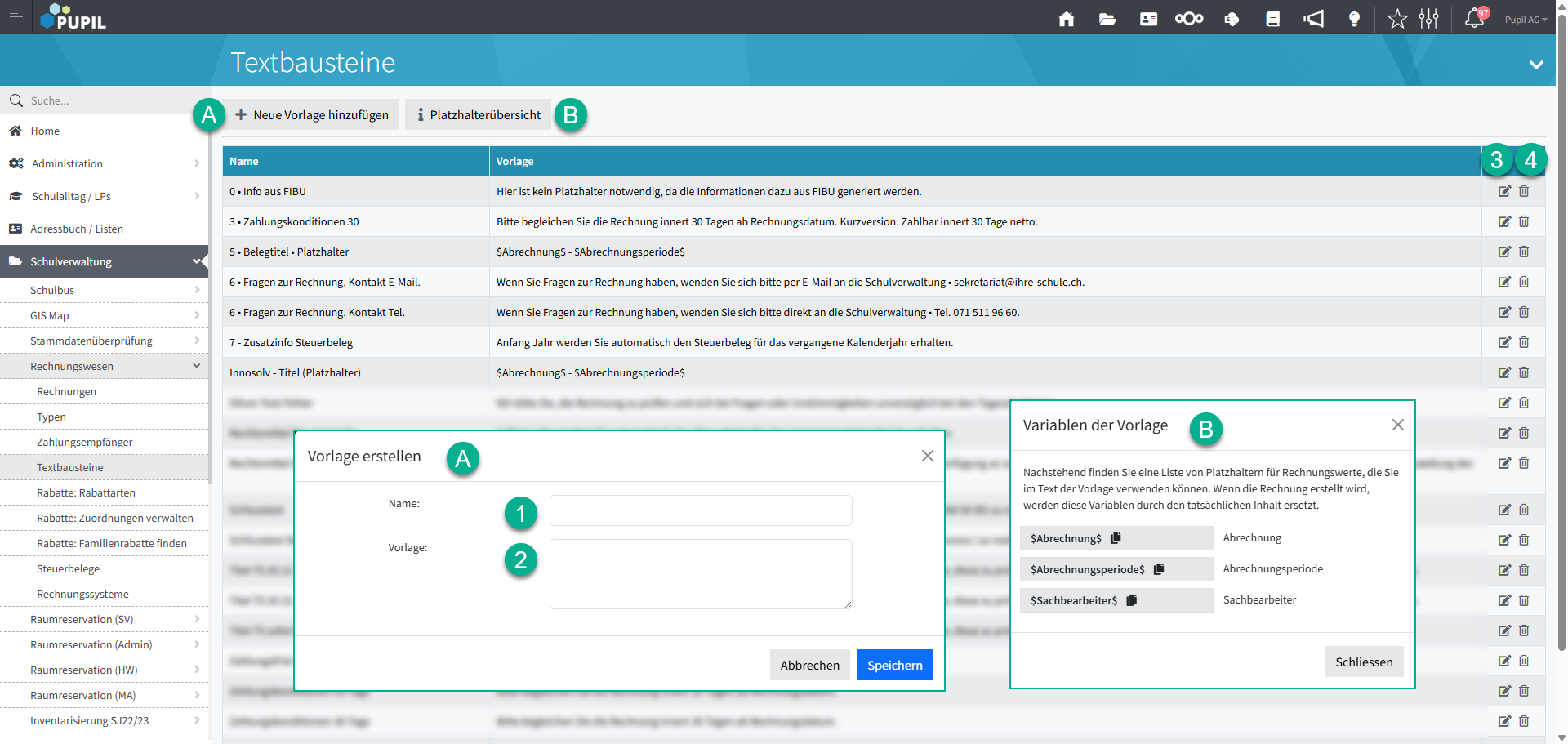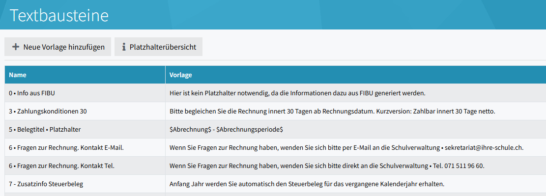 Mit dem Button [+ Neue Vorlage hinzufügen ] können im Modal "Vorlage erstellen" Textbausteine erstellt werden. Diese können bei 'Rechnungswesen - Typen' verwendet werden. Mit Button [ Platzhalterübersicht ] werden im Modal "Variablen der Vorlage" die verfügbaren Platzhalter mit Bezug zum Modul "Rechnung stellen" des entsprechenden PUPIL Moduls (z. B. Musikschule, Tagesstruktur etc.