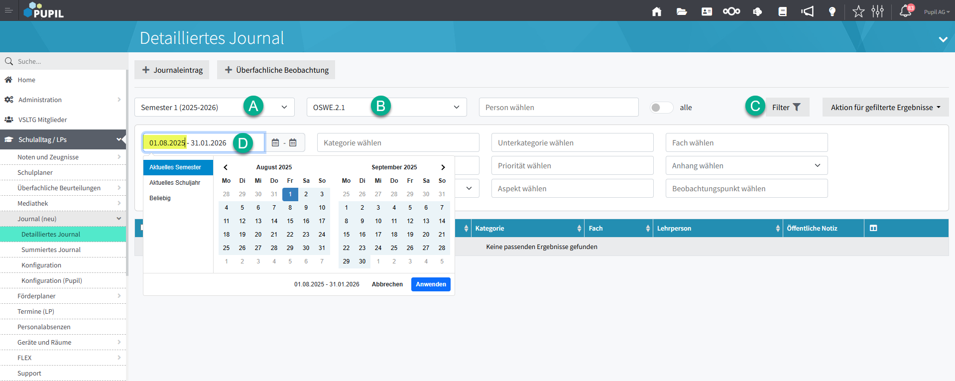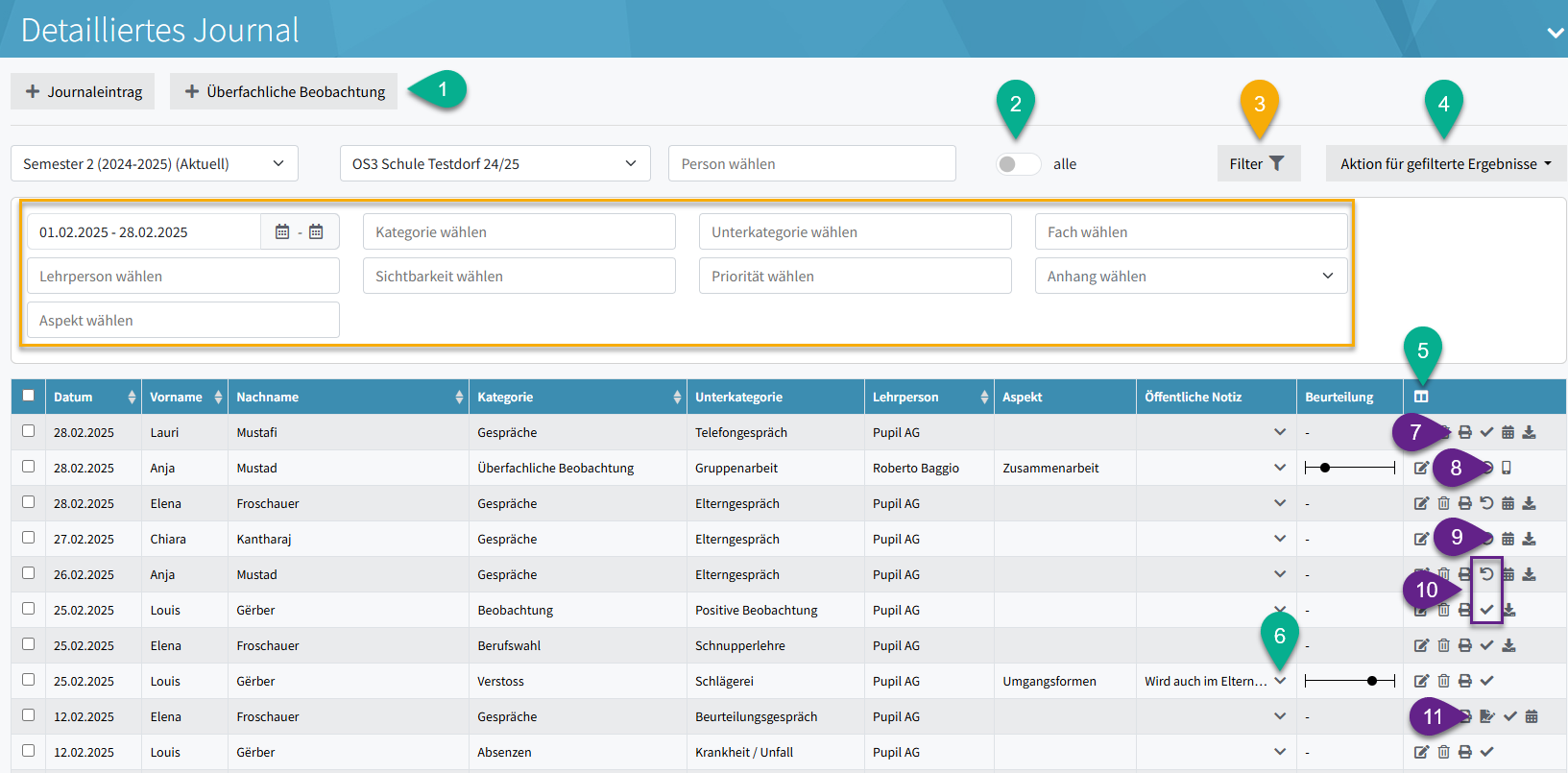 Das detaillierte Journal ist eine tabellarische Auflistung von allen Journaleinträgen, die für eine Klasse/Gruppe gemacht wurden.