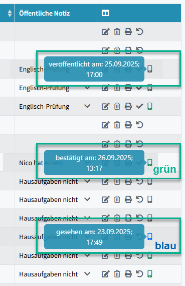 - Veröffentlichung auf dem Elternportal: Wurde der Eintrag auf dem Elternportal veröffentlicht, wird das Telefon dunkelgrau angezeigt. Wurde der Eintrag von den Eltern gesehen, ändert sich die Farbe auf blau und wurde der Eintrag sogar bestätigt, ändert sich die Farbe auf grün. Zur Information: Eltern erhalten keine Push-Mitteilung, wenn etwas aus dem Journal im Elternportal veröffentlicht wird.