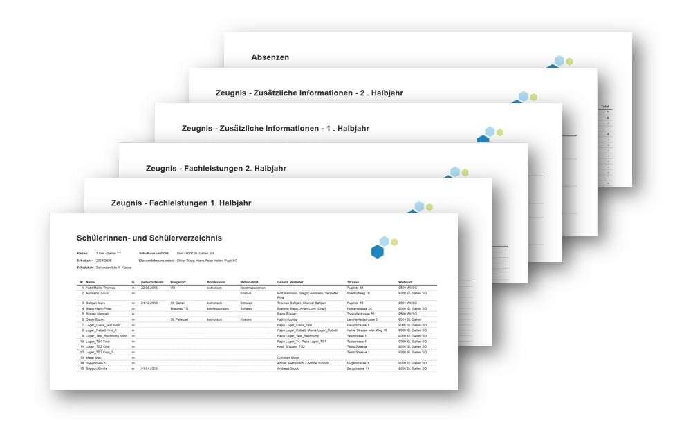 Beispiel eines Satzes Klassenliste mit Zeugnis- und Absenzenlisten.