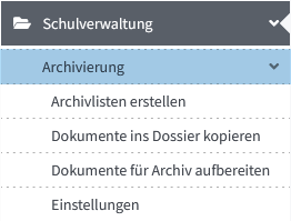 Diese Funktion erstellt die für das Archiv notwendigen Daten (Zeugnis- und Klasseninformationen) im Archivformat eCH-160. Diese Daten können anschliessend manuell ins Langzeitarchiv übertragen werden.