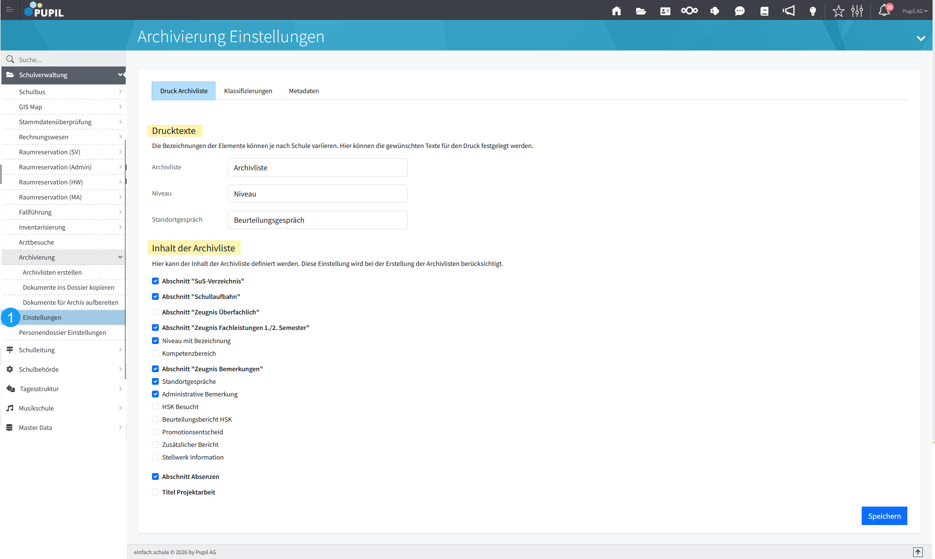 Bei Drucktexte lassen sich die PUPIL Begriffe Archivliste, Niveau und Standortgespräch durch eigene Benennungen für die Druckausgabe ersetzen.