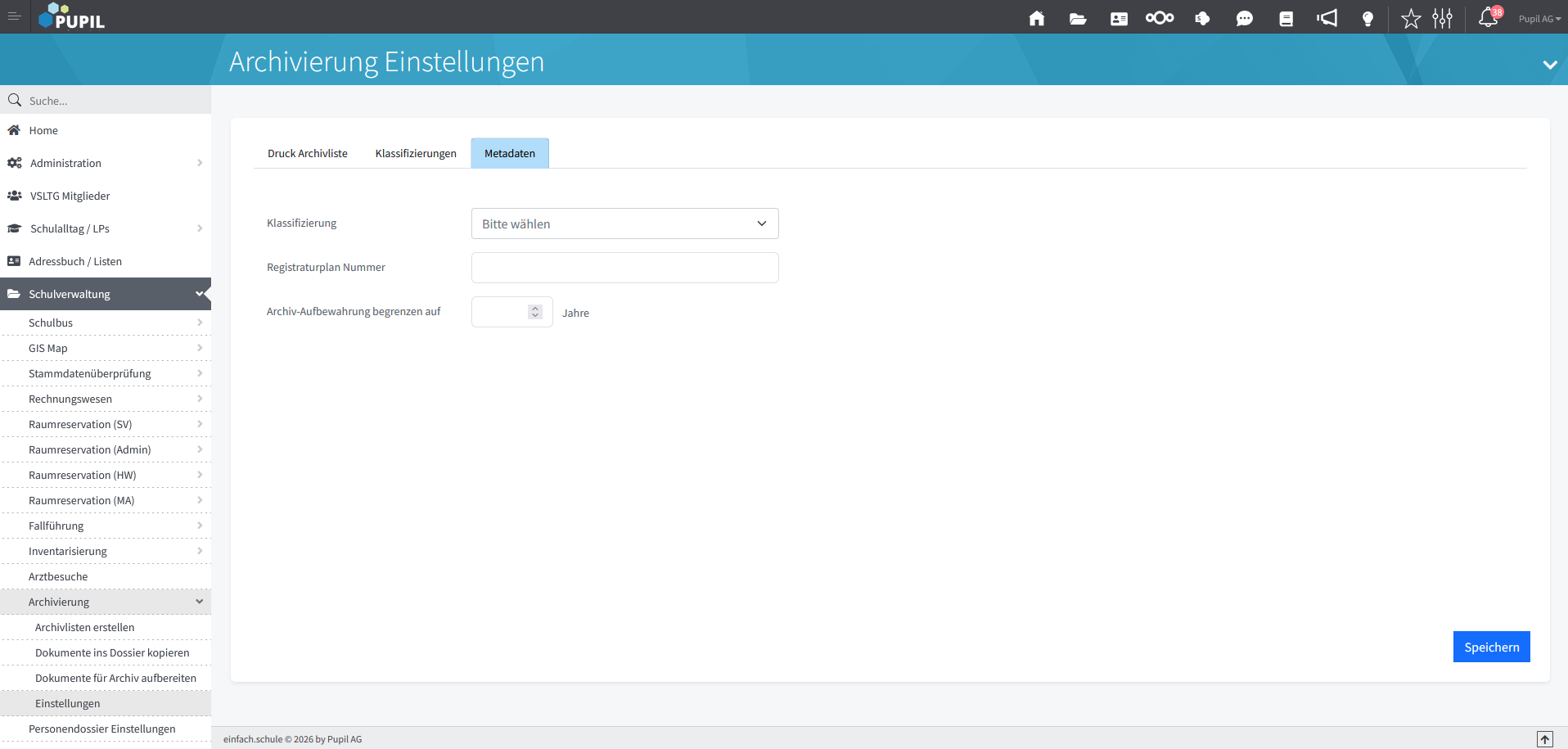 Die Ansicht "Archivierung Einstellungen" enthält die Register "Druck Archivliste", "Klassifizierungen" und "Metadaten".