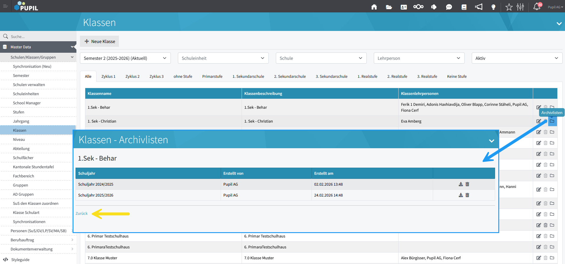 In Master Data / Klassen können die Archivlisten der verschiedenen Schuljahre eingesehen werden. Dies stellt eine PUPIL interne Ablage der Archivlisten dar.