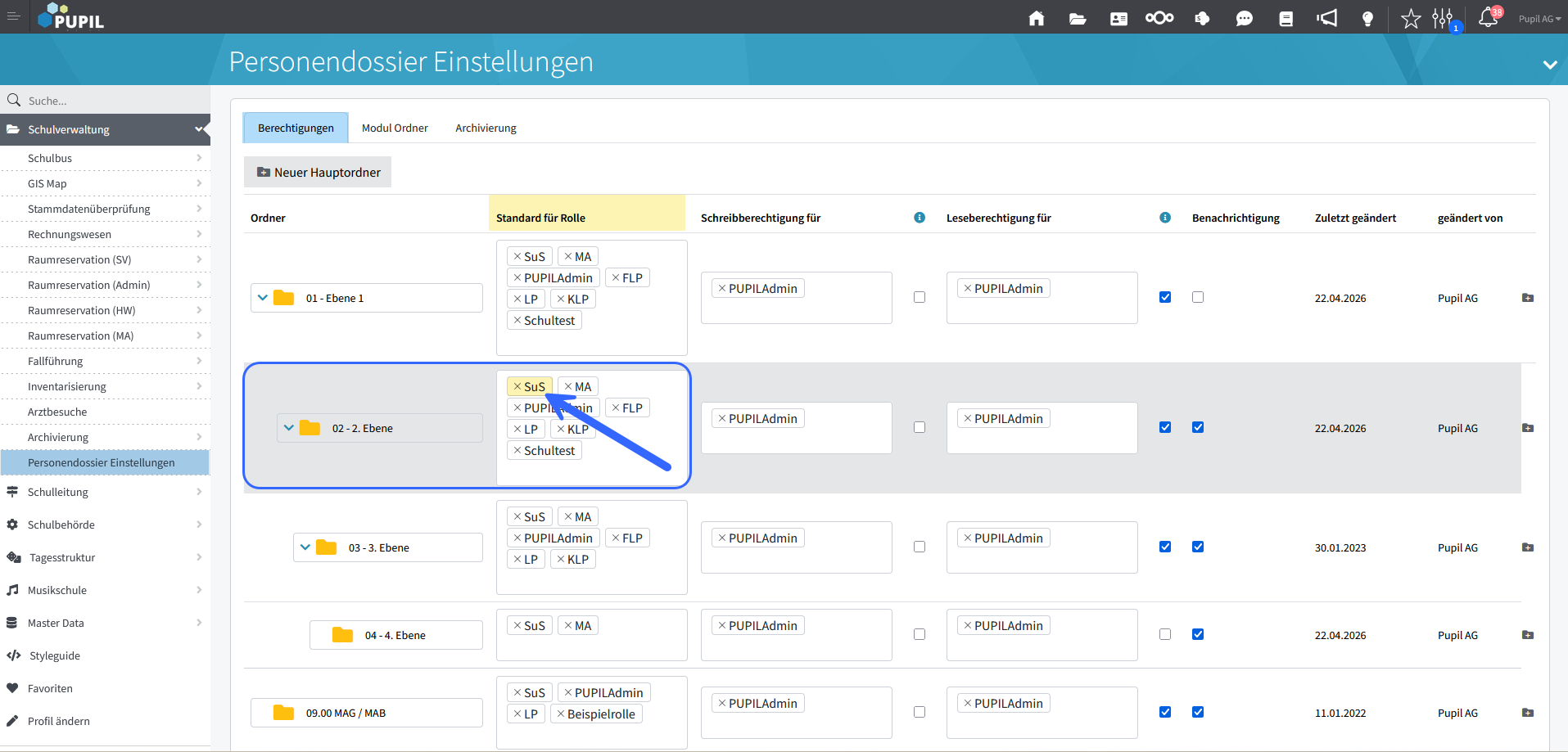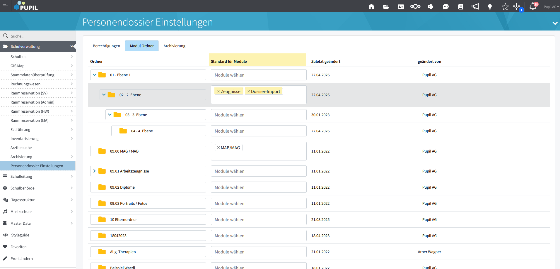 Im Register Modul Ordner sind in der Spalte "Standard für Module" die Werte "Zeugnisse" und "Dossier-Import" zuzuordnen. Die beiden Werte können je einmal ausgewählt werden. Sie können in unterschiedlichen Ordner u/o Ebenene erfasst werden.