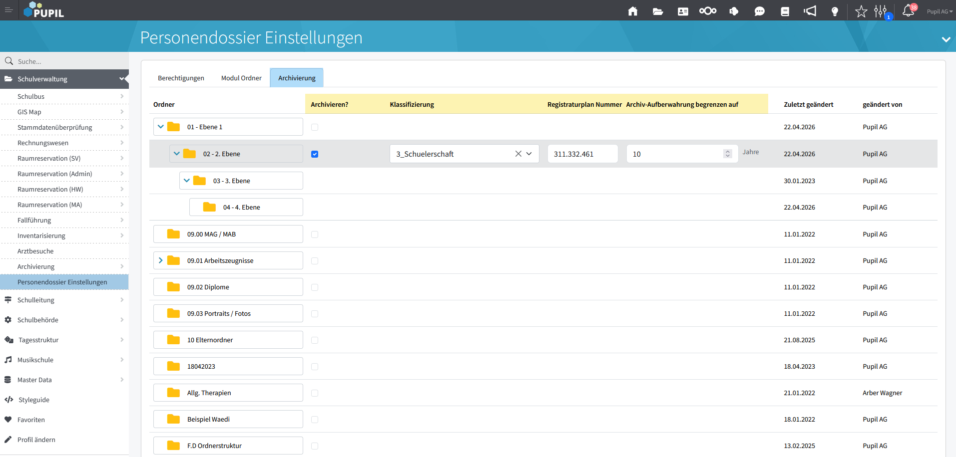 In PUPIL steht unter → Schulverwaltung mit dem Modul ARCHIVIERUNG ein praktisches Werkzeug zur Verfügung, um alle Zeugnis relevanten Daten systematisch zu archivieren. Zudem lassen sich Zeugnisse direkt ins Personendossier kopieren. Und ausgewählte Ordner aus dem Personendossier lassen sich ebenfalls archivieren.