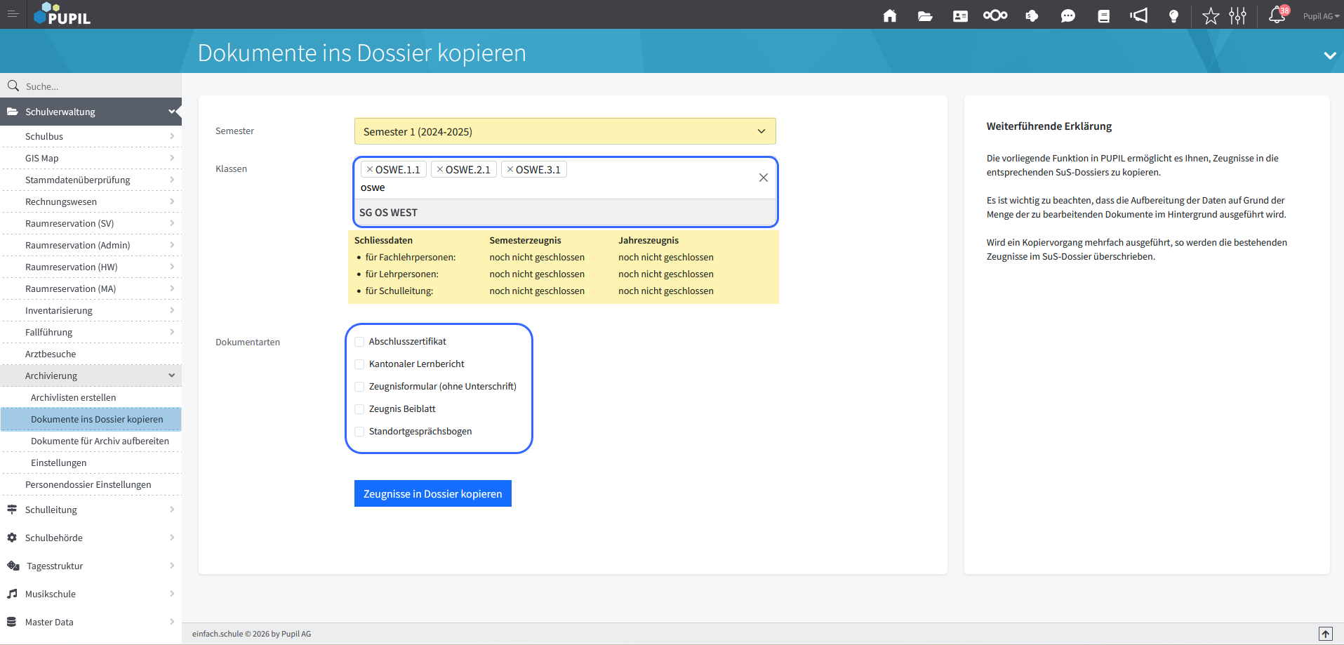 Die vorliegende Funktion in PUPIL ermöglicht es Ihnen, Zeugnisse in die entsprechenden SuS-Dossiers zu kopieren.