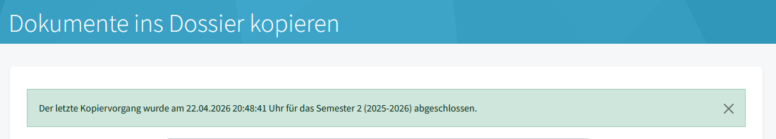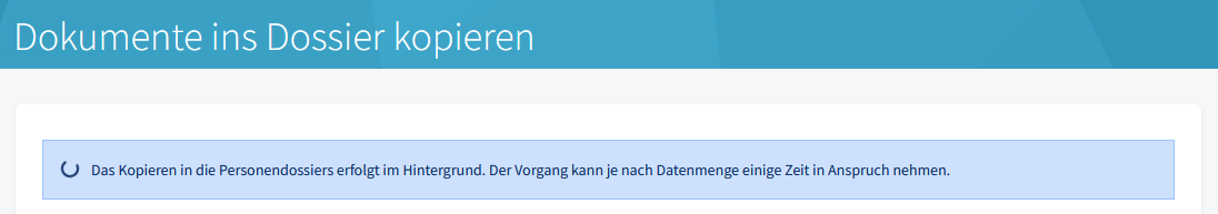 Mit Button [ Zeugnisse ins Dossier kopieren ] wird der Job gestartet und im Hintergrund ausgeführt. Dies bedeutet, dass diese Seite verlassen werden kann, ohne dass der Job dadurch abgebrochen wird.