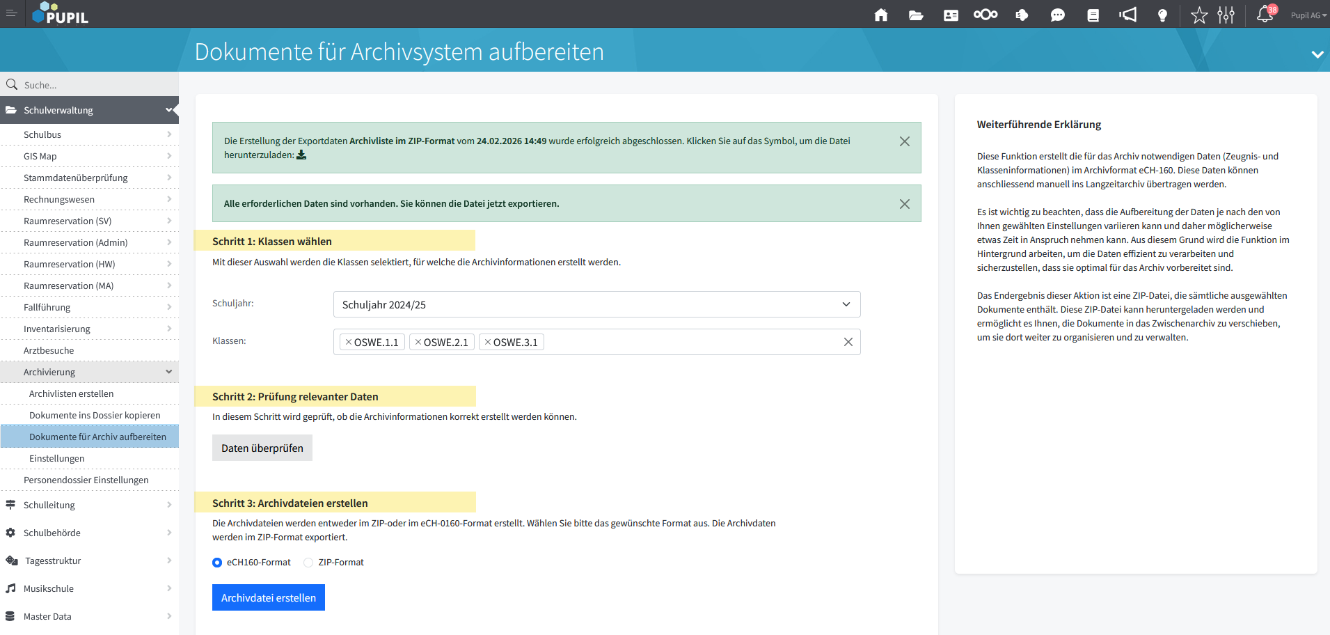 Zum Schluss werden die Zeugnis- und Klasseninfomation in eine Exportdatei im Archivformat eCH-160 aufbereitet.
