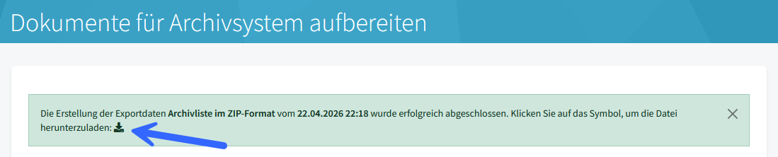 Die Erstellung der Exportdaten Archivliste im ZIP-Format vom tt.mm.yyyy 00:00 wurde erfolgreich abgeschlossen. Klicken Sie auf das Symbol, um die Datei herunterzuladen: Icon Download.